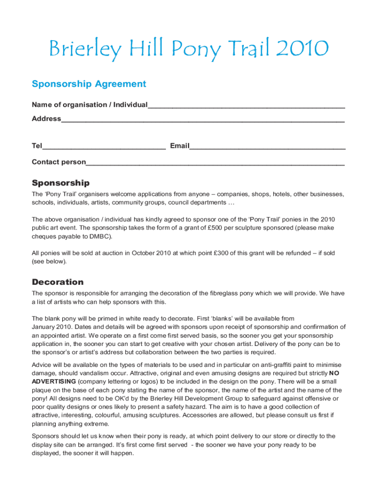 Briefly Hill Pony Trail 2010 Sponsorship Agreement Name of organization / Individual Address Tel Email Contact person Sponsorship The Pony Trail organizers welcome applications from anyone companies,