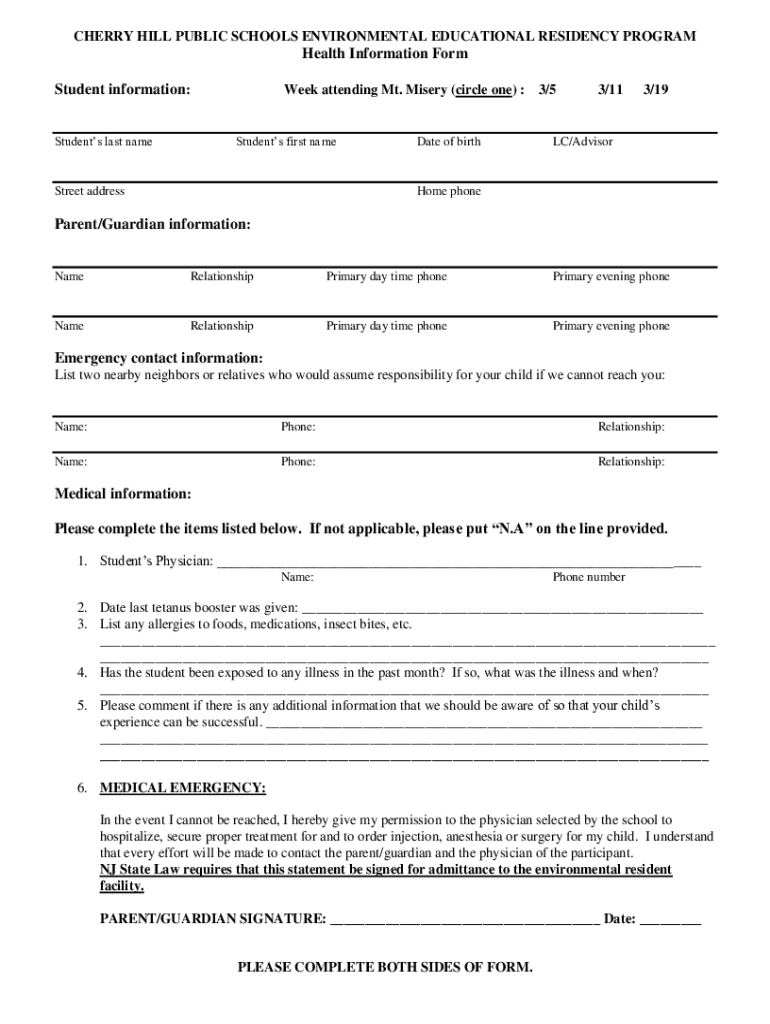 CHERRY HILL PUBLIC SCHOOLS ENVIRONMENTAL EDUCATIONAL RESIDENCY PROGRAMHealth Information Form