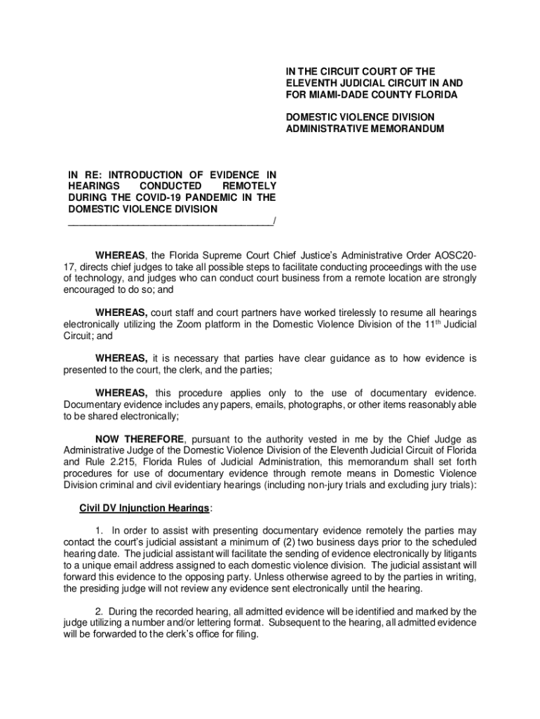 IN THE CIRCUIT COURT OF THE ELEVENTH JUDICIAL CIRCUIT IN AND FOR MIA MIDADE COUNTY FLORIDA DOMESTIC VIOLENCE DIVISION ADMINISTRATIVE MEMORANDUM IN RE: INTRODUCTION OF EVIDENCE IN HEARINGS CONDUCTED