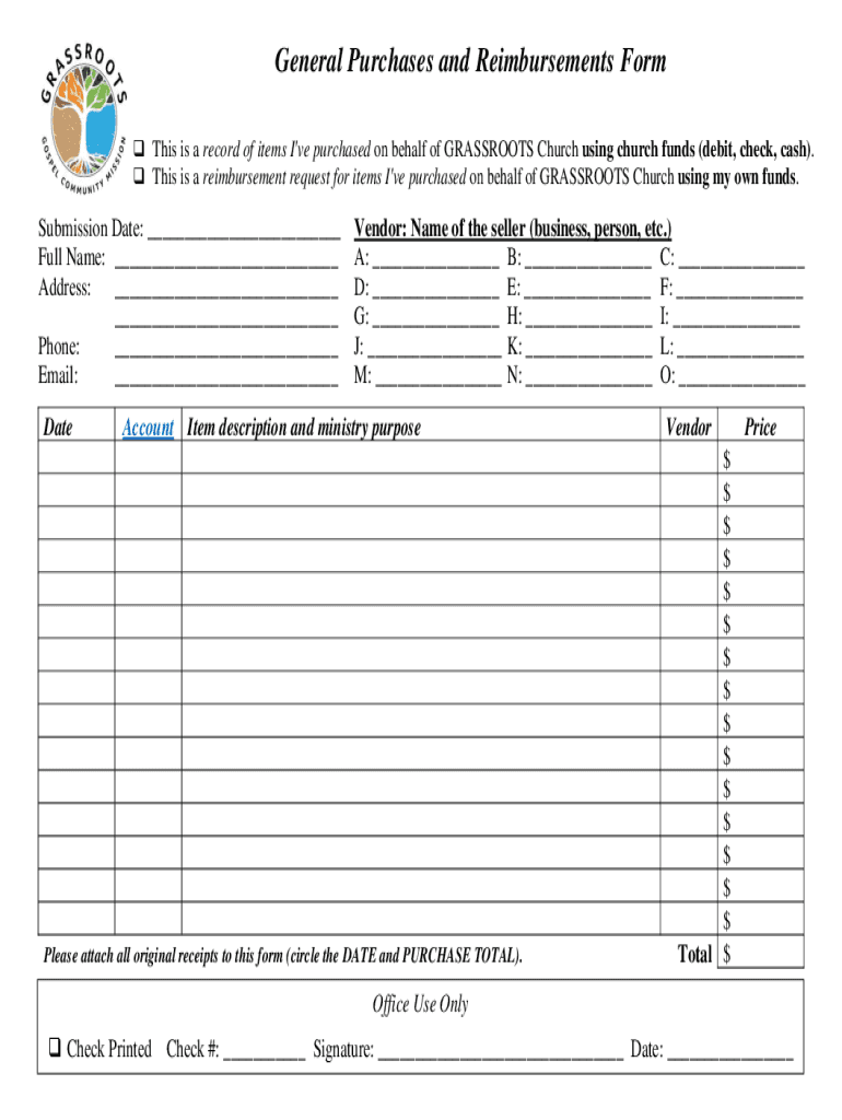 General Purchases and Reimbursements Form This is a record of items I've purchased on behalf of GRASSROOTS Church using church funds (debit, check, cash). This is a reimbursement request for items