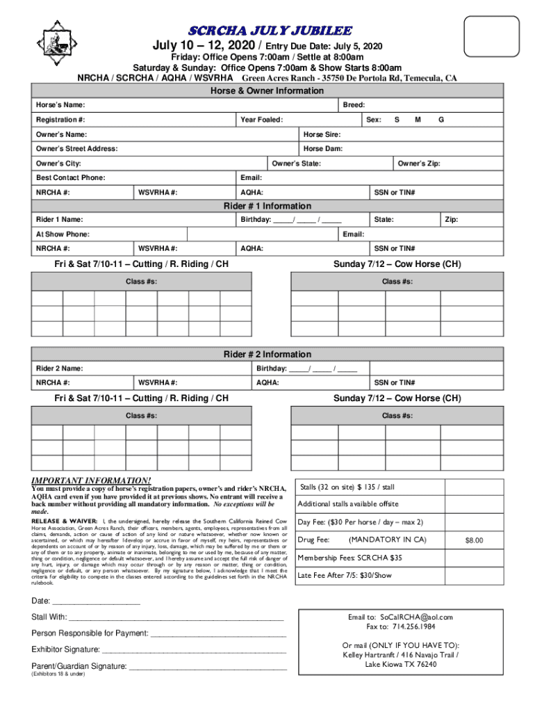 SCORCH JULY JUBILEE July 10 12, 2020 / Entry Due Date: July 5, 2020, Friday: Office Opens 7:00am / Settle at 8:00am Saturday & Sunday: Office Opens 7:00am & Show Starts 8:00am NRC HA / SCORCH / AQUA