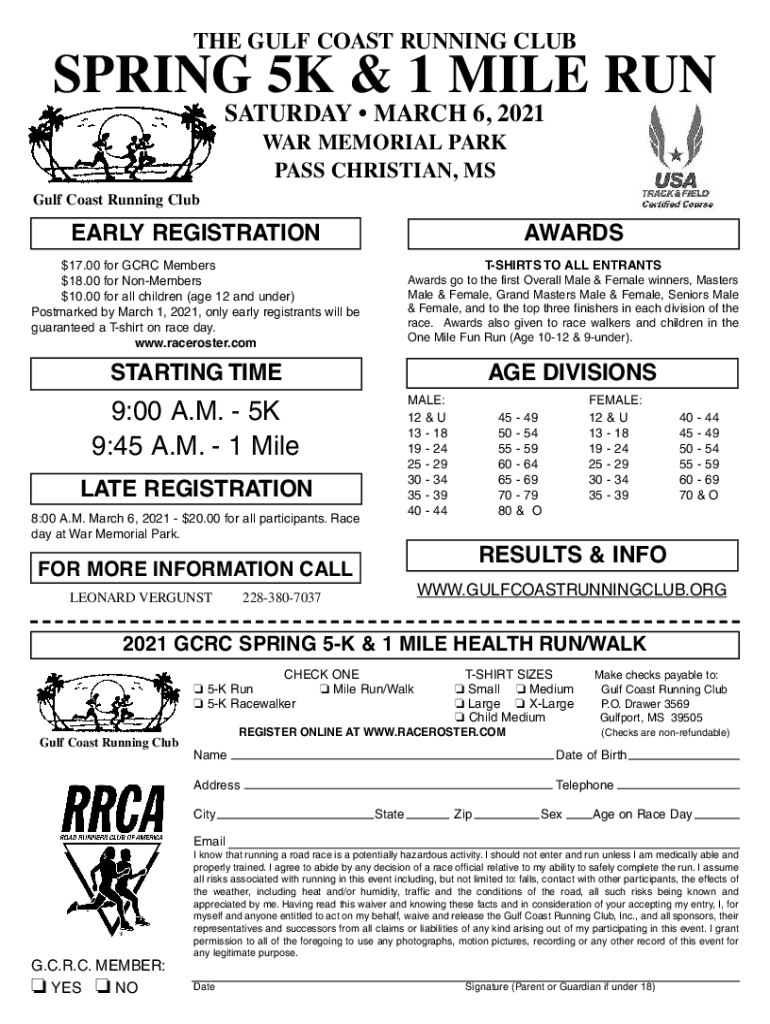 SPRING 5K & 1-MILE RUN THE GULF COAST RUNNING CLUBSATURDAY MARCH 6, 2021, WAR MEMORIAL PARK PASS CHRISTIAN, Gulf Coast Running Clearly REGISTRATIONTSHIRTS TO ALL ENTRANTS$17.00 for CRC Members $18.00