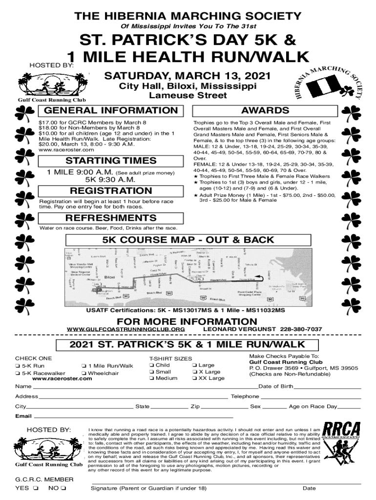 THE HIBERNIA MARCHING SOCIETY ST. PATRICKS Day 5K & 1 MILE HEALTH RUN/WALK Of Mississippi Invites You To The 31stp p p p p p p p pp City Hall, Biloxi, Mississippi Lame use StreetGENERAL INFORMATION$17.00