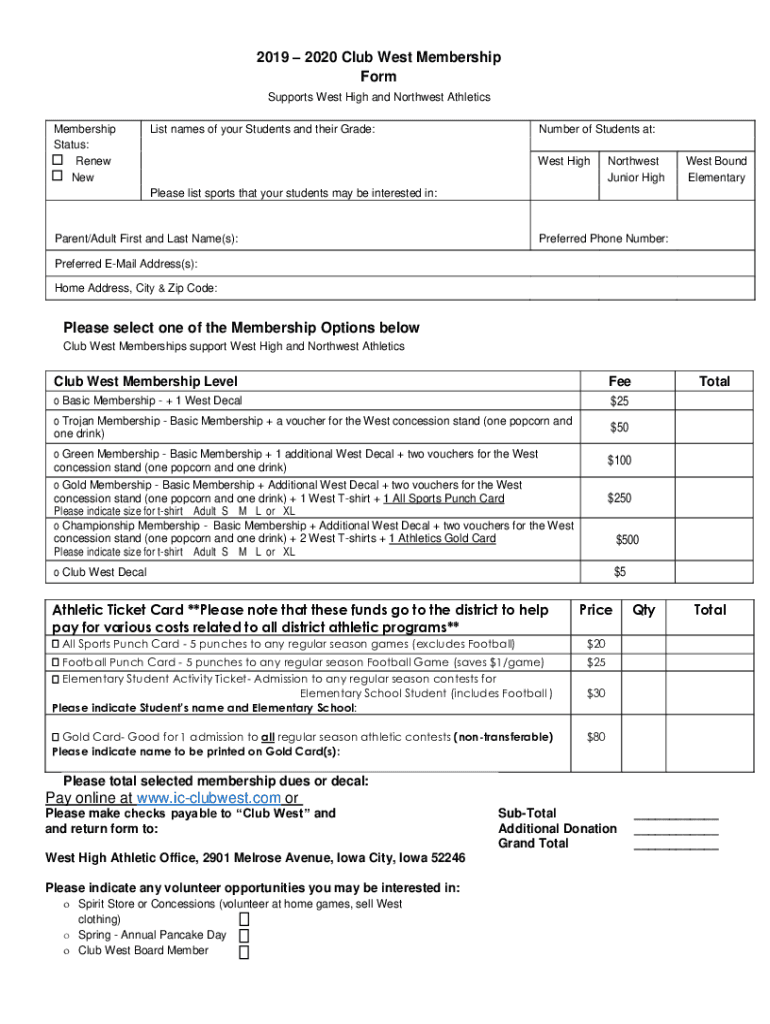 2019 2020 Club West Membership Form Supports West High and Northwest Athletics Membership Status: Renew The Newest names of your Students and their Grade:Number of Students at: West High Northwest