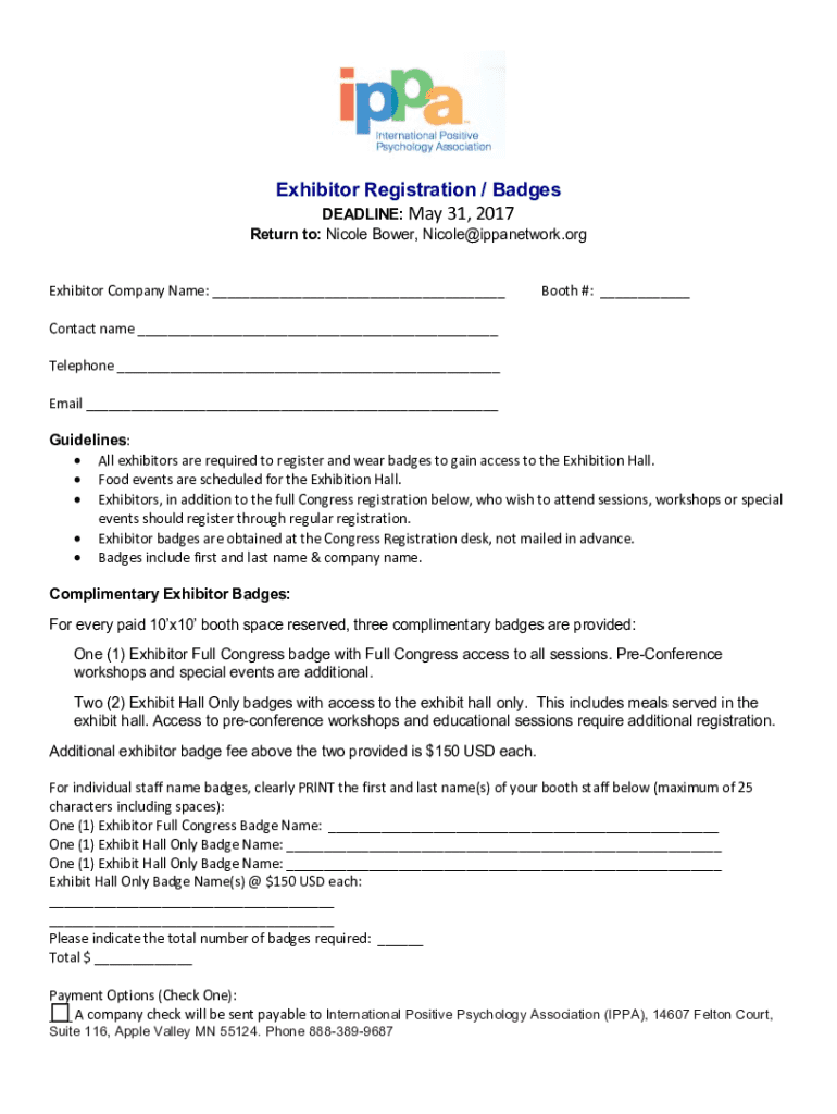 Exhibitor Registration / Badges DEADLINE: May31,2017 Return to: Nicole Bower, Nicole PlayNetwork.org ExhibitorCompanyName: Booth#: Contact name Telephone Email Guidelines: AllexhibitorsarerequiredtoregisterandwearbadgestogainaccesstotheExhibitionHall.