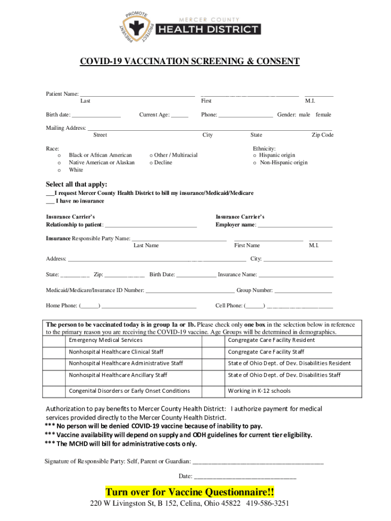 COVID-19 VACCINATION SCREENING & CONSENTPatient Name: Last Firstborn date: Phone: Gender: recurrent Age: M.I. femaleMailing Address: Street City State Zip Code Race: o black or African American Native