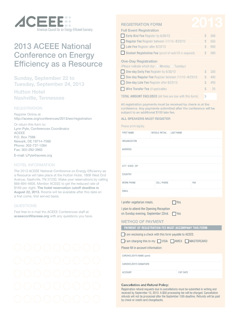 2013 REGISTRATION FORM Full Event Registration 2013 AC EEE National Conference on Energy Efficiency as a Resource Sunday, September 22 to Tuesday, September 24, 2013, Hutton Hotel Nashville, Tennessee
