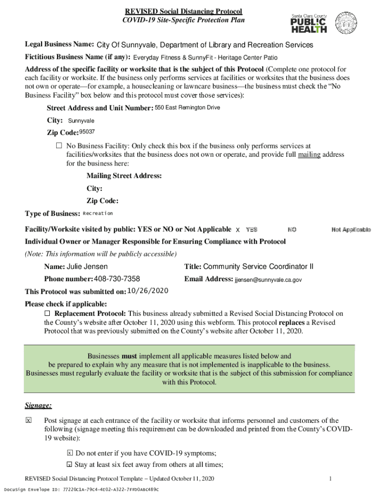 Jensen Sunnyvale.ca.revised Social Distancing Protocol COVID-19 Interspecific Protection Plan Legal Business Name: City Of Sunnyvale, Department of Library and Recreation Services Fictitious Business
