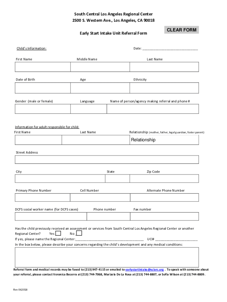 South Central Los Angeles Regional Center 2500 S. Western Ave., Los Angeles, CA 90018 Early Start Intake Unit Referral Format: Child's Information: First Namecheap Formidable Name Date of BirthAgeGender