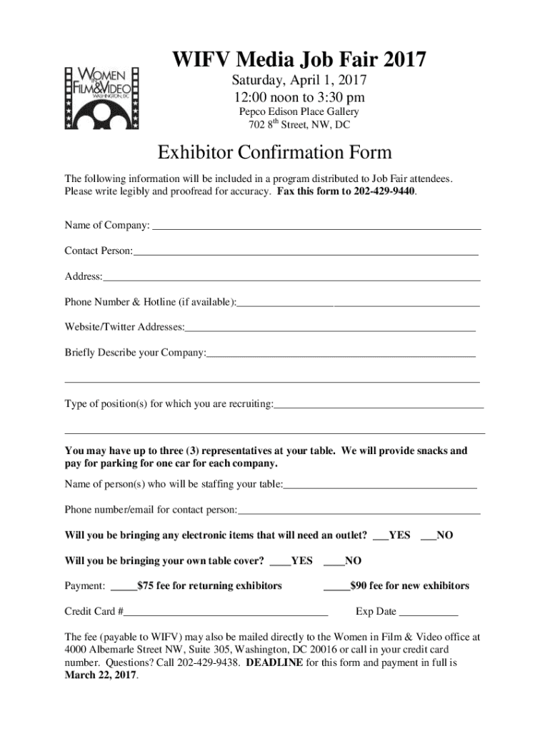 WIFE Media Job Fair 2017 Saturday, April 1, 2017 12:00 noon to 3:30 pm PERCO Edison Place Gallery 702 8th Street, NW, Exhibitor Confirmation Form Atlanta the following information will be included