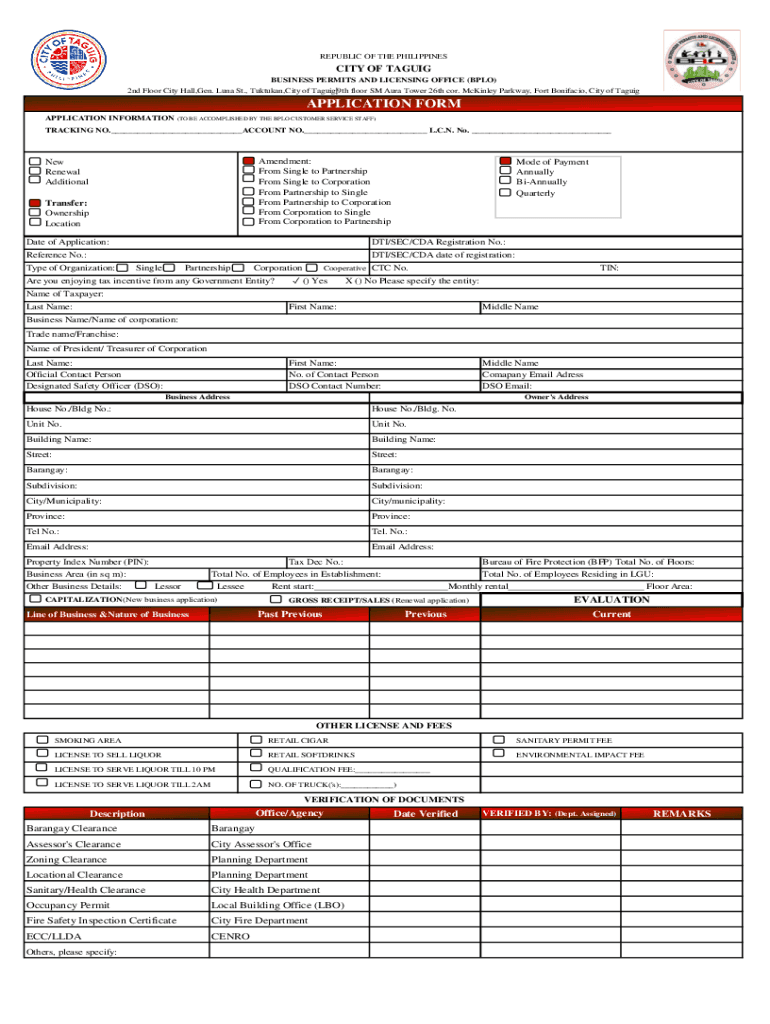 The Philippines Business Permit Application Form is a government document used by businesses to apply for or renew permits and licenses in the City of Taguig.