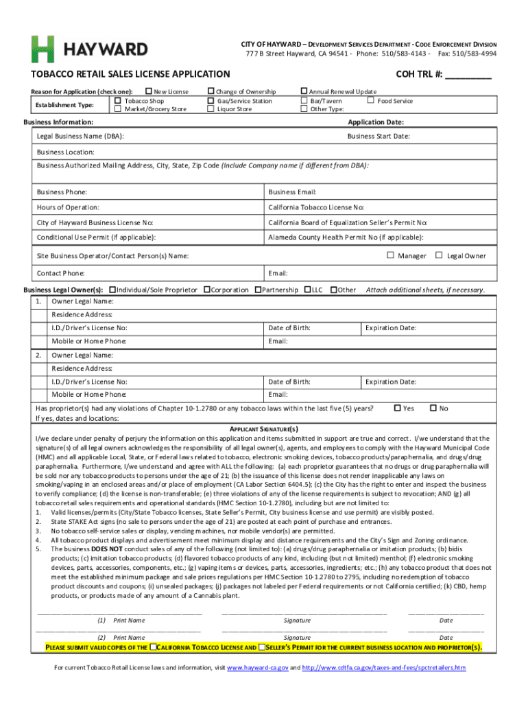 CITY OF HAYWARD DEVELOPMENT SERVICES DEPARTMENT CODE ENFORCEMENT DIVISION 777 B Street Hayward, CA 94541 Phone: 510/5834143 Fax: 510/5834994TOBACCO RETAIL SALES LICENSE APPLICATION Reason for Application
