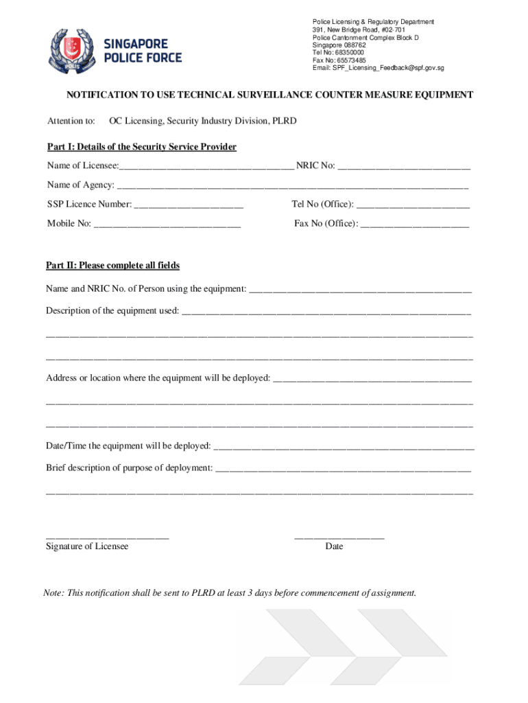 Police Licensing & Regulatory Department 391, New Bridge Road, #02701 Police Cantonment Complex Block D Singapore 088762 Tel No: 68350000 Fax No: 65573485 Email: SPF Licensing Feedback SPF.gov.notification