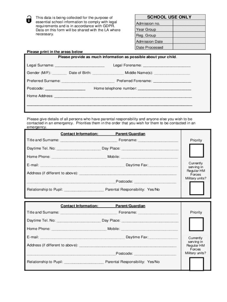 This data is being collected for the purpose of essential school information to comply with legal requirements and is in accordance with GDPR. Data on this form will be shared with the LA where necessary.
