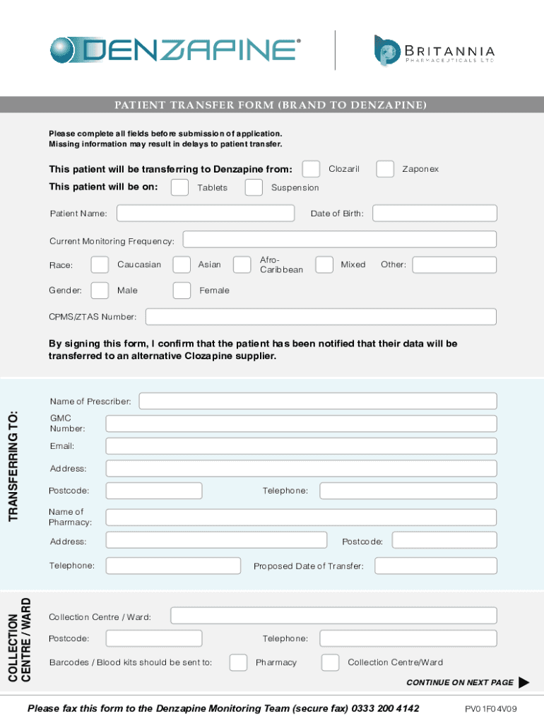 Get the free PATIENT TRANSFER FORM (BRAND TO DENZAPINE) Continued