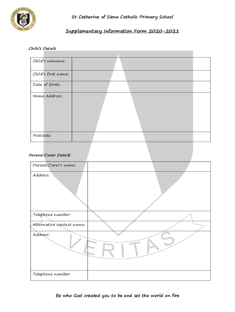 St Catherine of Saint Catholic Primary SchoolSupplementary Information Form 20202021Childs Details Child's surname: Child's first name: Date of Birth: Home Address:Postcode:Parent/Carer Details Parent/Carers