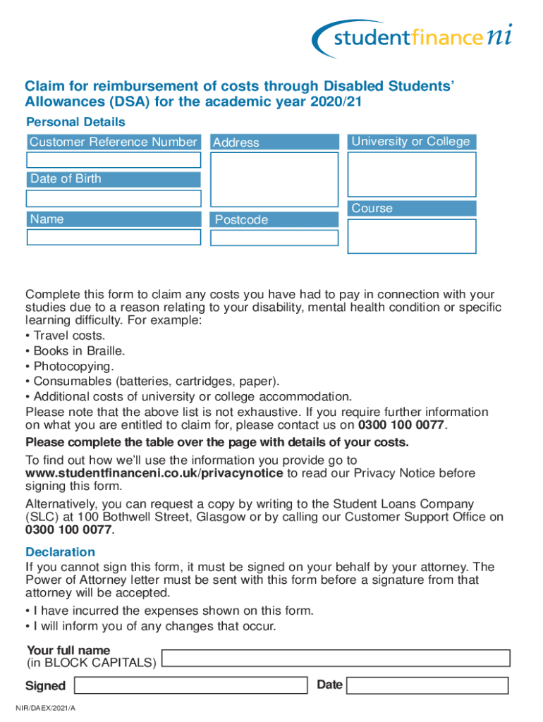 Anyone who is eligible for DSA (Disabled Students' Allowances) and has incurred expenses related to their disabilities during the year 2020-21 may require the DSA expenses claim form for that specific period.