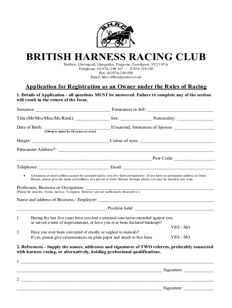 BRITISH HARNESS RACING CLUB Belfry, Llwynpiod, Llangeitho, Treason, Ceredigion, SY25 6TA Telephone: (01974) 298 367 / 07834 539 292 Fax: (01974) 298 089 Email: BHC. Office yahoo.co.application for
