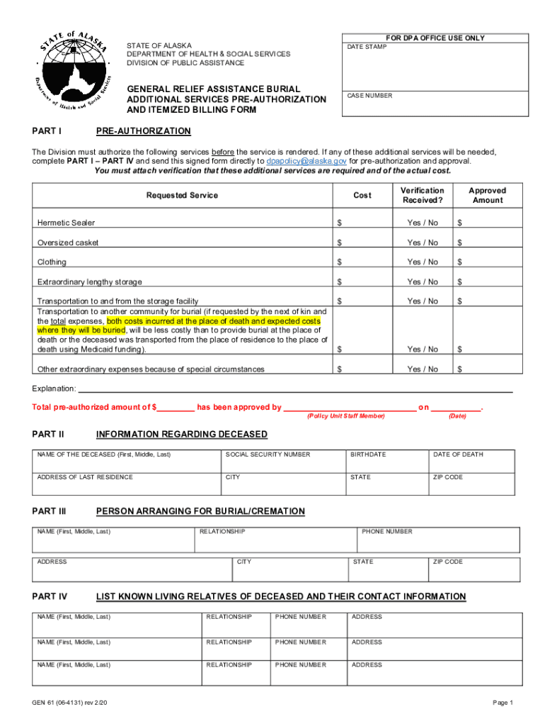 FOR DPA OFFICE USE ONSTAGE OF ALASKA DEPARTMENT OF HEALTH & SOCIAL SERVICES DIVISION OF PUBLIC ASSISTANCEDATE STAMPGENERAL RELIEF ASSISTANCE BURIAL ADDITIONAL SERVICES PREAUTHORIZATION AND ITEMIZED