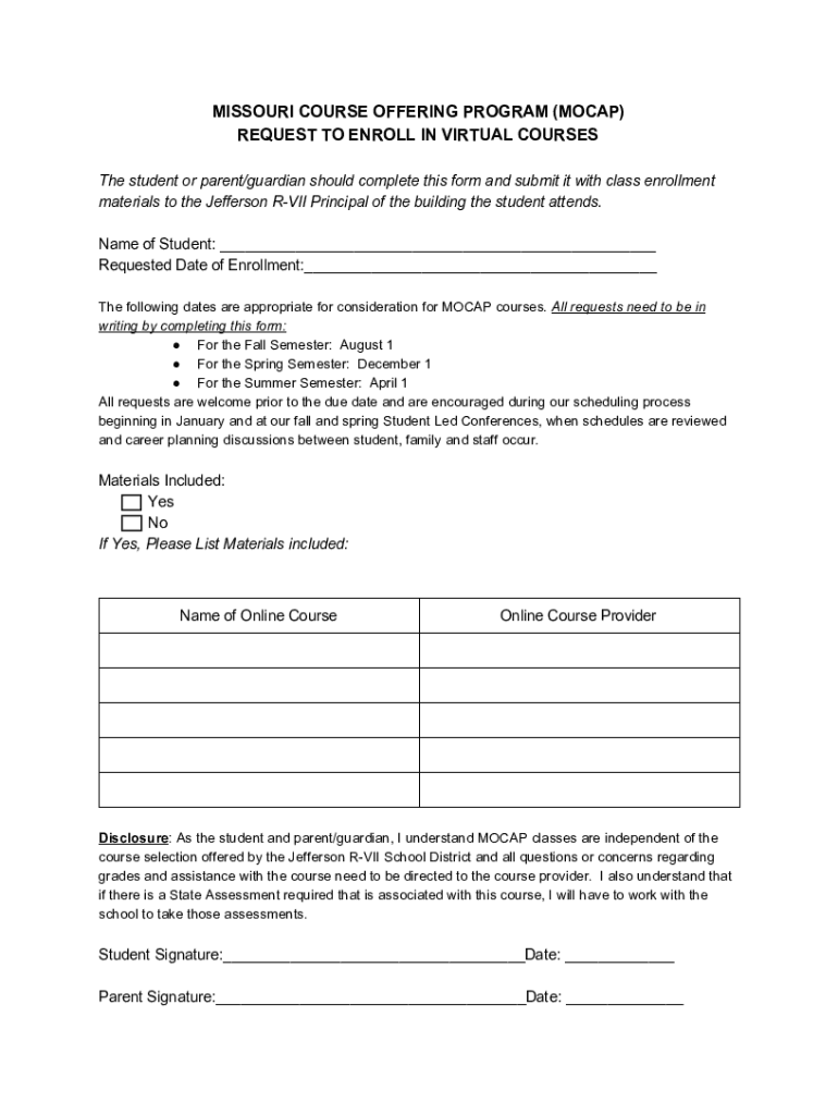 MISSOURI COURSE OFFERING PROGRAM (MO CAP) REQUEST TO ENROLL IN VIRTUAL COURSES The student or parent/guardian should complete this form and submit it with class enrollment materials to the Jefferson