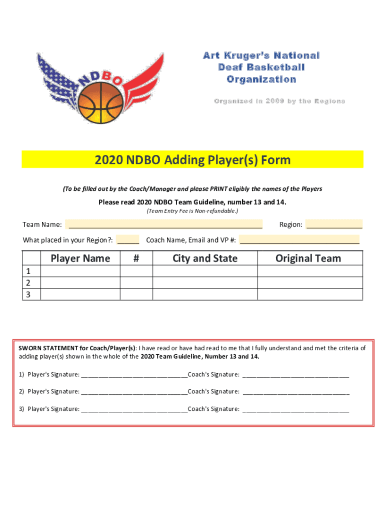 Art Kruger's National Deaf Basketball Organization Organized in 2009 by the Regions2020 NDB Adding Player(s) Form (To be filled out by the Coach/Manager and please PRINT eligibly the names of the