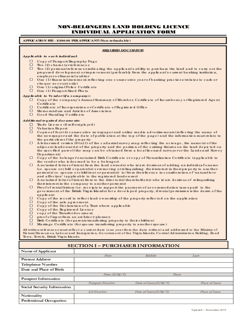 Get the free NON-BELONGERS LAND HOLDING LICENCE INDIVIDUAL APPLICATION FORM - bvi gov