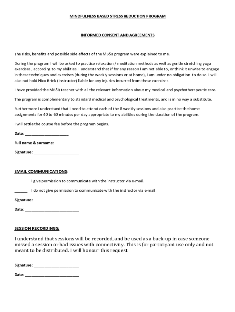 MINDFULNESS BASED STRESS REDUCTION PROGRAMINFORMED CONSENT AND Agreements risks, benefits and possible side effects of the MBR program were explained to me.