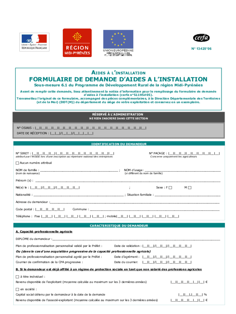 N 13425×06AIDES LINSTALLATIONFORMULAIRE DE DEMANDED AIDES A INSTALLATION Saussure 6.1 Du Program de Dveloppement Rural DE la region Midi-Pyrénées Savant DE repair Bette demand, life attentiveness