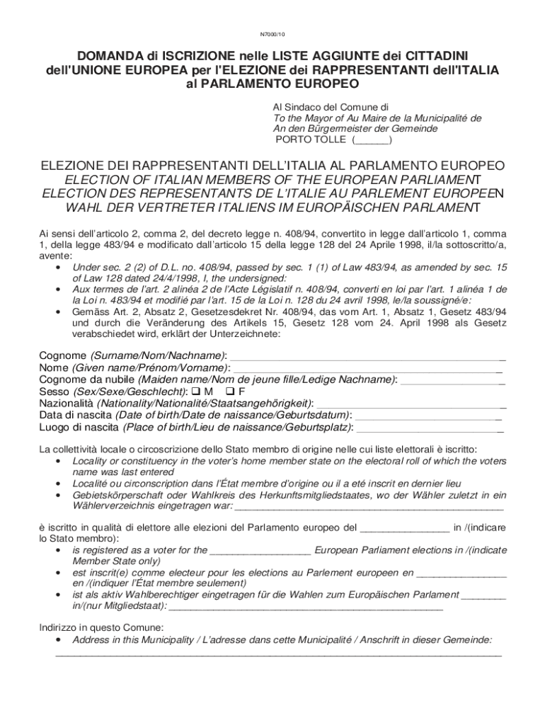 N7000/10DOMANDA DI ISCRIZIONE Nellie LIST AGGIE DEI COTTAGING dell 'UNION EUROPEAN per l 'ELECTION DEI RAPPRESENTANTI dell 'ITALIA all PARLIAMENT EUROPE Al Since Del Commune DI To the Mayor of Au