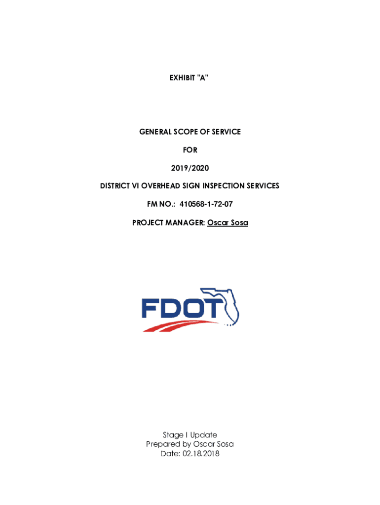 EXHIBIT “A “GENERAL SCOPE OF SERVICE FOR 2019/2020 DISTRICT VI OVERHEAD SIGN INSPECTION SERVICES FM NO.: 41056817207 PROJECT MANAGER: Oscar Hostage I Update Prepared by Oscar Sosa Date: 02.18.2018EXHIBIT