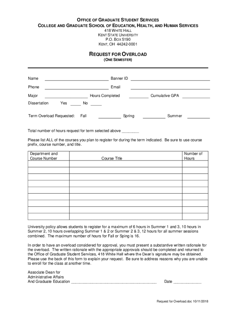 OFFICE OF GRADUATE STUDENT SERVICES COLLEGE AND GRADUATE SCHOOL OF EDUCATION, HEALTH, AND HUMAN SERVICES 418 WH ITE HALL KENT STATE UNIVERSITY P.O. BOX 5190 KENT, OH 442420001REQUEST FOR OVERLOAD