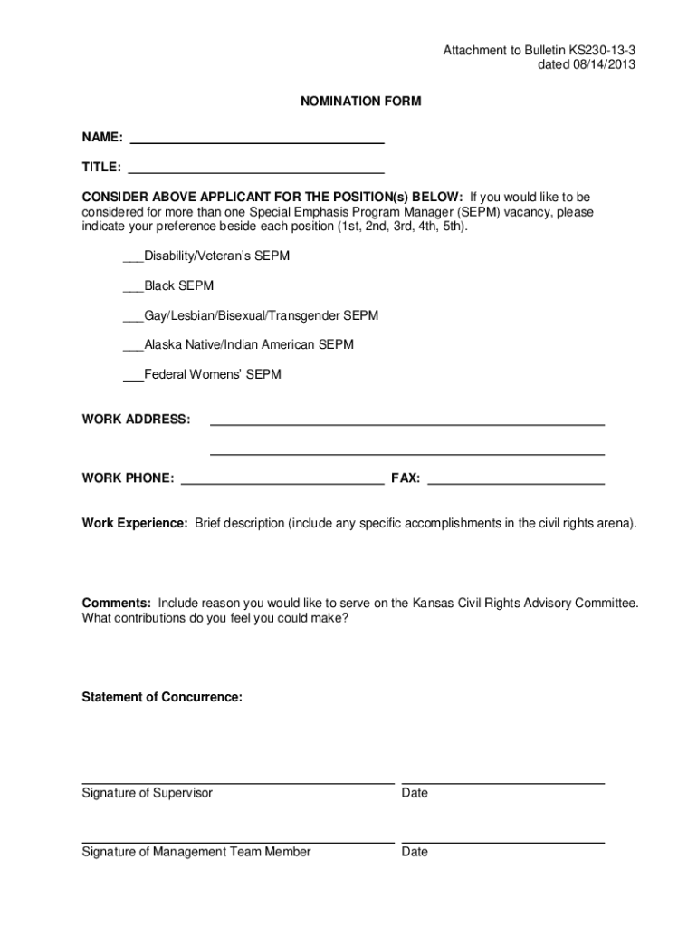 Attachment to Bulletin KS230133 dated 08/14/2013 NOMINATION FORM NAME: TITLE: CONSIDER ABOVE APPLICANT FOR THE POSITION(s) BELOW: If you would like to be considered for more than one Special Emphasis