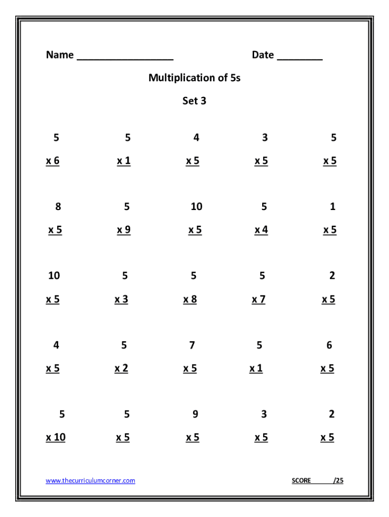 Name Date Multiplication of 5s Set 3 55435×6×1×5×5×5851051×5×9×5×4×5105552×5×3×8×7×545756×5×2×5×1×555932x 10×5×5×5×5www.thecurriculumcorner.comSCORE/25