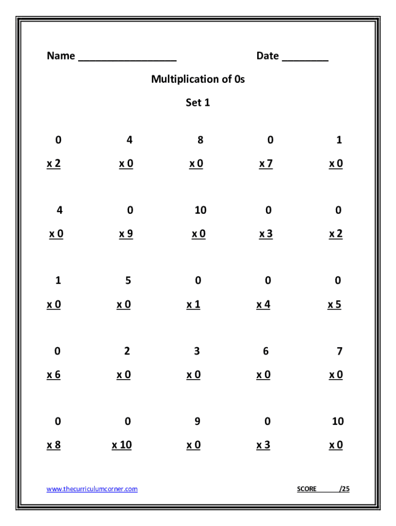 Name Date Multiplication of 0s Set 1 04801×2×0×0×7×0401000×0×9×0×3×215000×0×0×1×4×502367×6×0×0×0×0009010×8x 10×0×3×0www.thecurriculumcorner.comSCORE/25