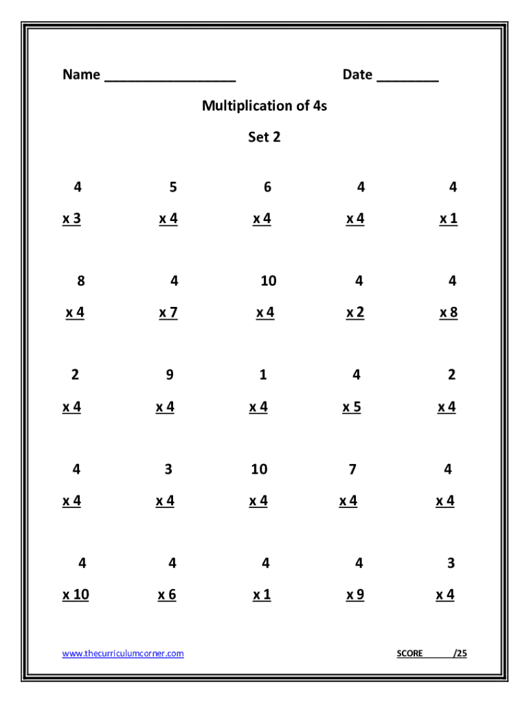 Name Date Multiplication of 4s Set 2 45644×3×4×4×4×1841044×4×7×4×2×829142×4×4×4×5×4431074×4×4×4×4×444443x 10×6×1×9×4www.thecurriculumcorner.comSCORE/25