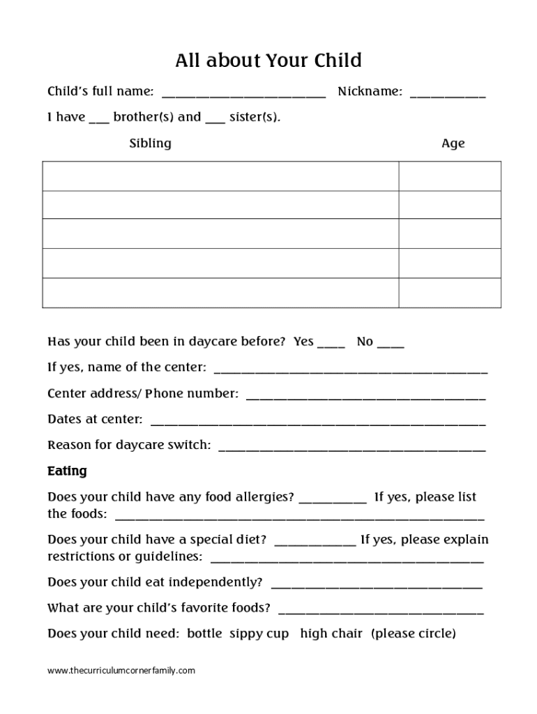 All about your child can be filled out by providing accurate and up-to-date information regarding your child's health, education, and general life updates.