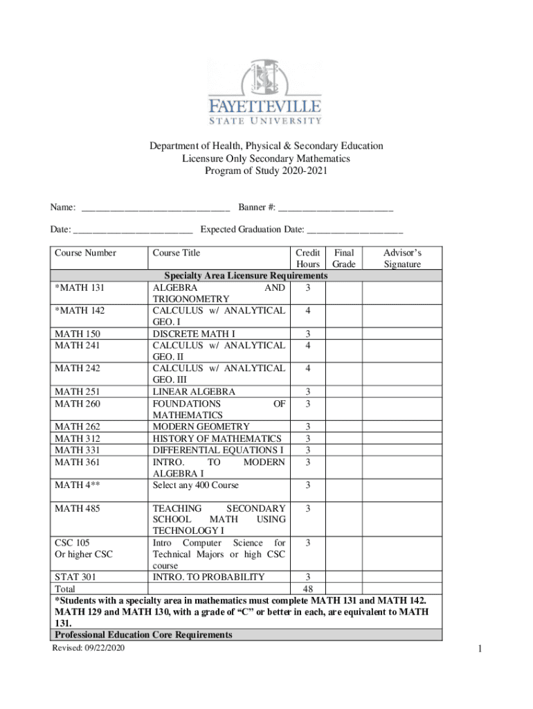 Department of Health, Physical & Secondary Education Licensure Only Secondary Mathematics Program of Study 20202021Name: Banner #: Date: Expected Graduation Date: Course Number×MATH 131 *MATH 142