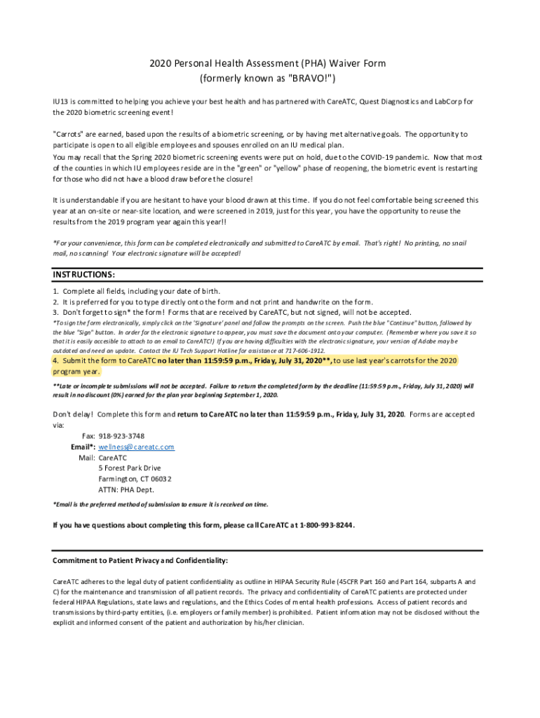 2020PersonalHealthAssessment(PHA)Waveform (formerlyknownas “BRAVO! “) IU13iscommittedtohelpingyouachieveyourbesthealthandhaspartneredwithCareATC,QuestDiagnosticsandLabCorpfor the2020biometricscreeningevent!