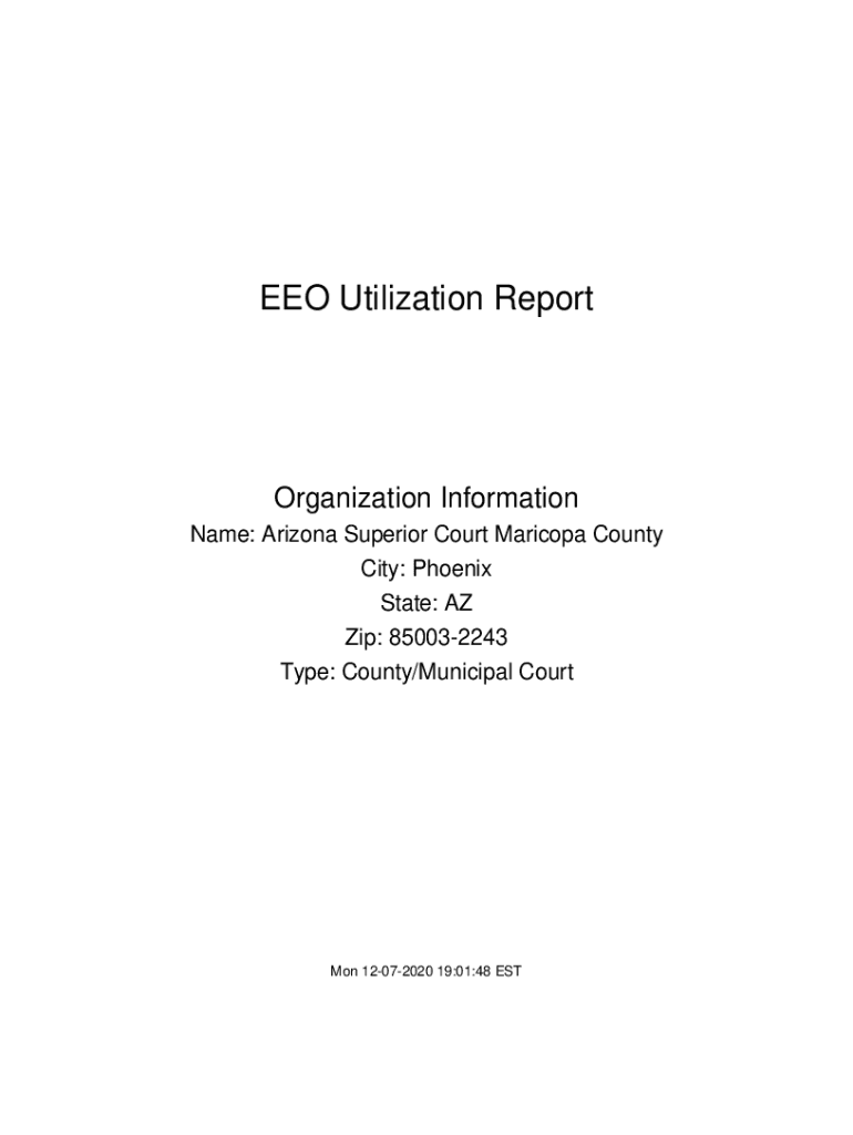 EEO Utilization ReportOrganization Information Name: Arizona Superior Court Maricopa County City: Phoenix State: AZ Zip: 850032243 Type: County/Municipal Court Mon 12072020 19:01:48 Estate 1: Introductory