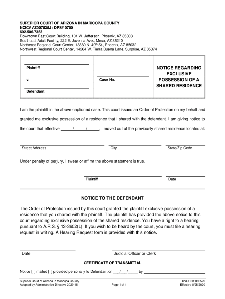 Get the free NOTICE REGARDING EXCLUSIVE POSSESSION OF A SHARED RESIDENCE. DVOP30f - superiorcourt...