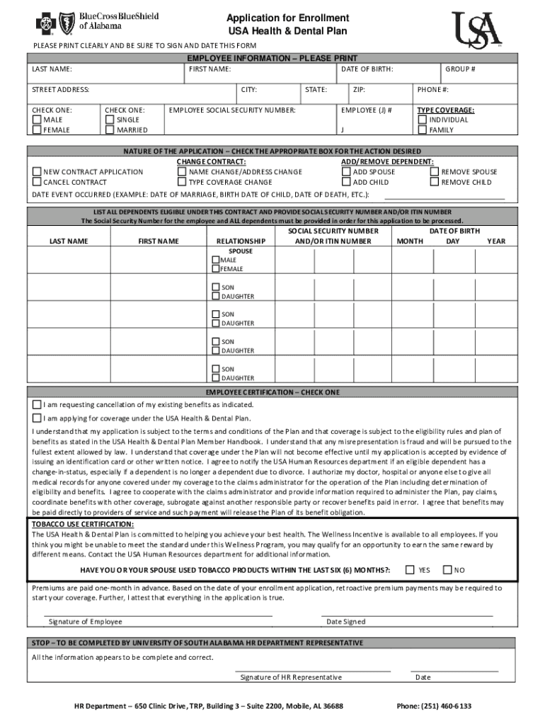 USA Health & Dental PlanBlueCrossBlueShield of AlabamaPLEASE PRINT CLEARLY AND BE SURE TO SIGN AND DATE THIS FORM