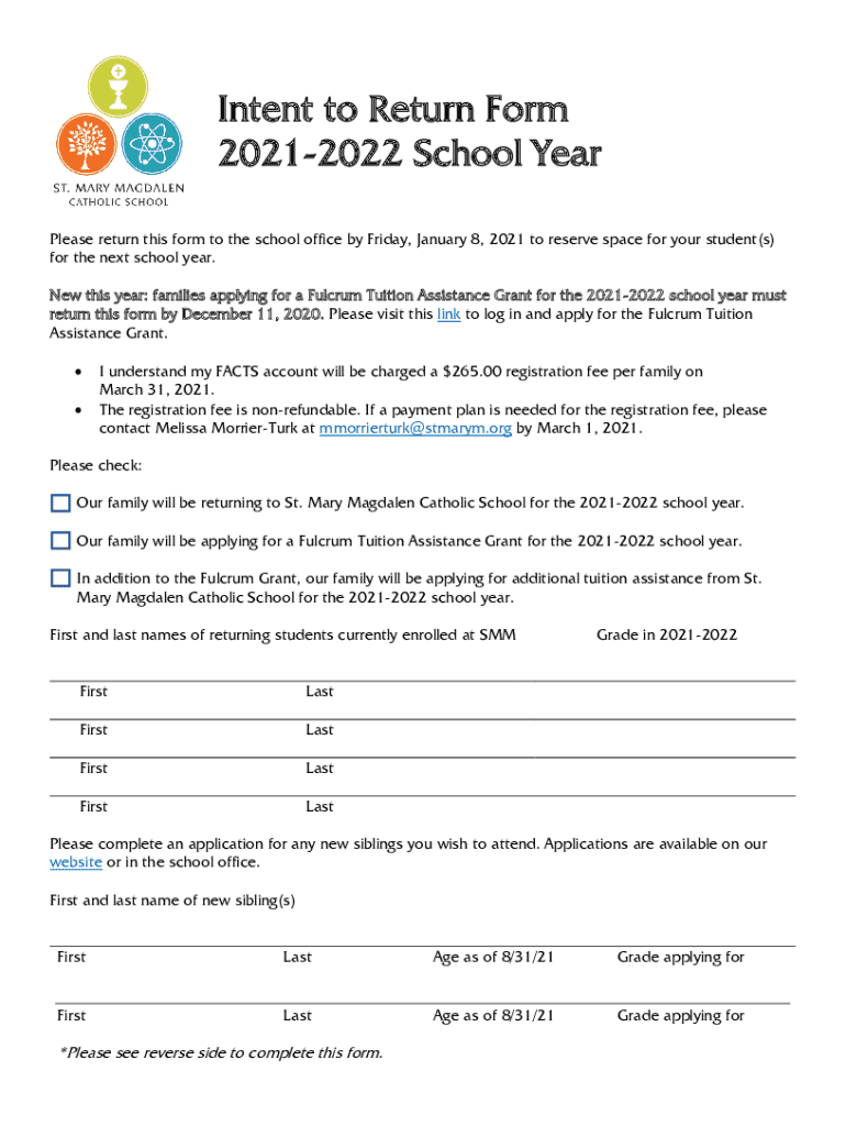 Intent to Return Form 20212022 School Year Please return this form to the school office by Friday, January 8, 2021, to reserve space for your student(s) for the next school year. New this year: families