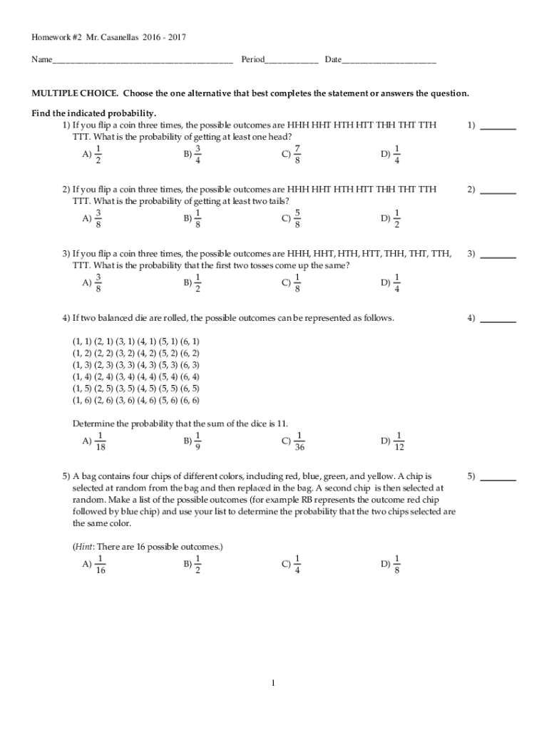 Homework #2 Mr. Casanovas 2016 2017 Name Period Date MULTIPLE CHOICE. Choose the one alternative that best completes the statement or answers the question. Find the indicated probability. 1) If you