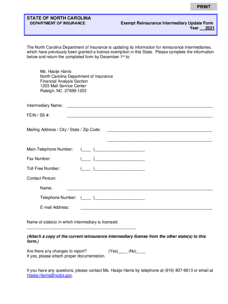 2021DEPARTMENT OF Insurance North Carolina Department of Insurance is updating its information for reinsurance intermediaries,