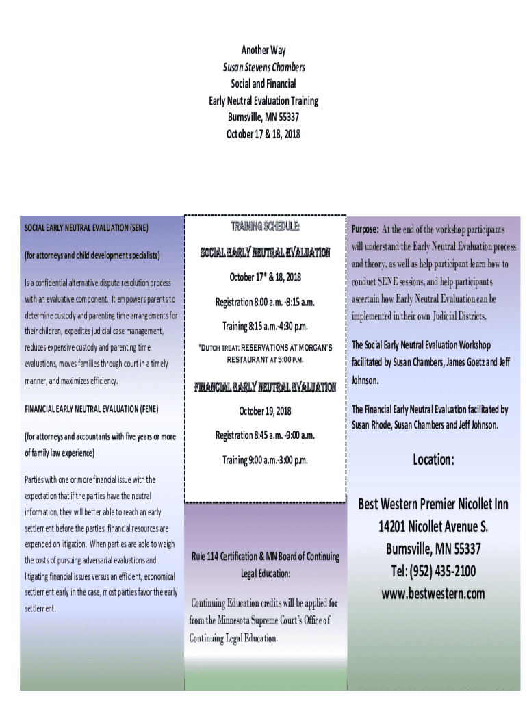Another Way Susan Stevens Chambers Social and Financial Early Neutral Evaluation Training Barnesville, MN 55337 October 17 & 18, 2018SOCIAL EARLY NEUTRAL EVALUATION (SEE) (for attorneys and child