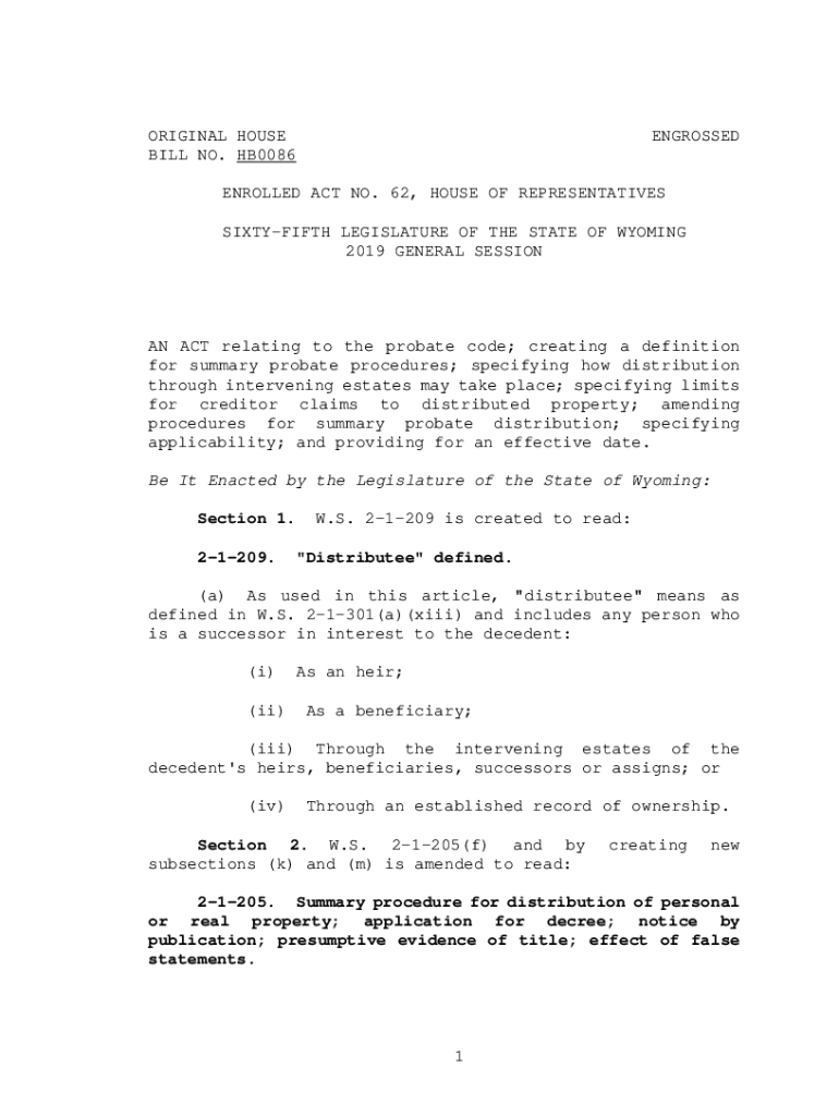 BILL NO. HB0086ENGROSSEDENROLLED ACT NO. 62, HOUSE OF REPRESENTATIVES