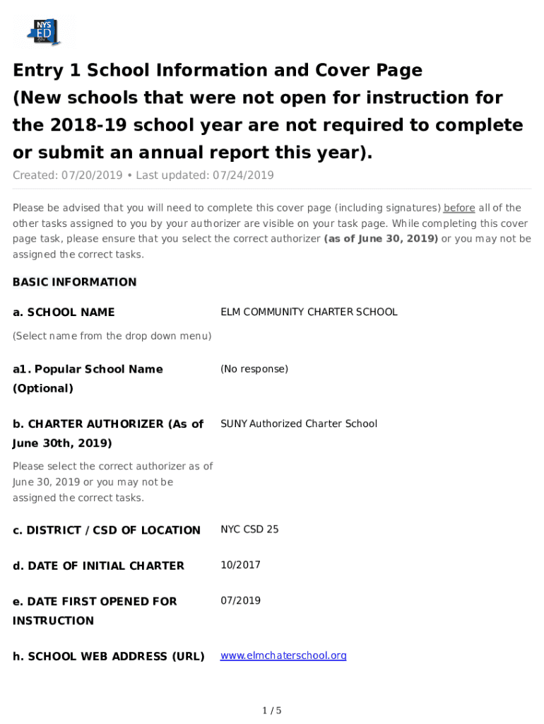 Entry 1 School Information and Cover Page(New schools that were not open for instruction for the 201819 school year are not required to complete or submit an annual report this year). Created: 07/20/2019