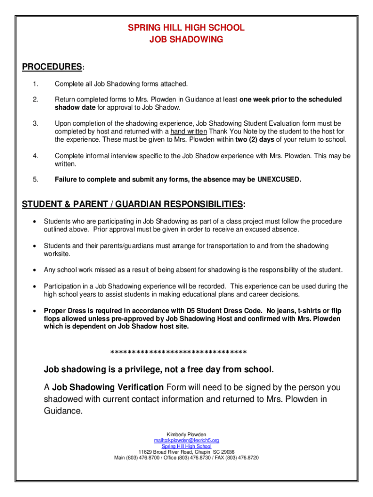1. Complete all Job Shadowing forms attached.2. Return completed forms to Mrs. Plowmen in Guidance at least one week prior to the scheduled