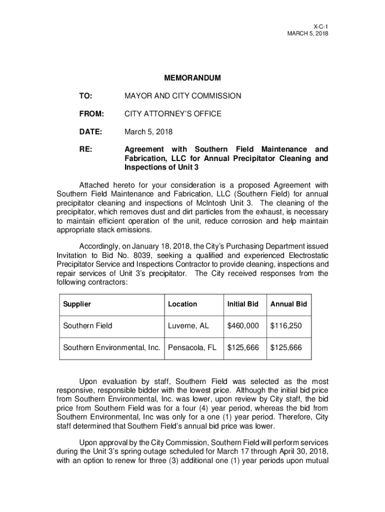 TO:MAYOR AND CITY COMMISSIONER:CITY ATTORNEYS OFFICIATE:March 5, 2018RE:Agreement with Southern Field Maintenance and