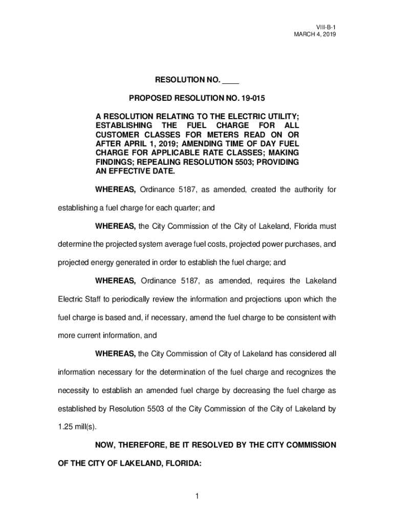 VIIIB1 MARCH 4, 2019RESOLUTION NO. PROPOSED RESOLUTION NO. 19015 A RESOLUTION RELATING TO THE ELECTRIC UTILITY; ESTABLISHING THE FUEL CHARGE FOR ALL CUSTOMER CLASSES FOR METERS READ ON OR AFTER APRIL